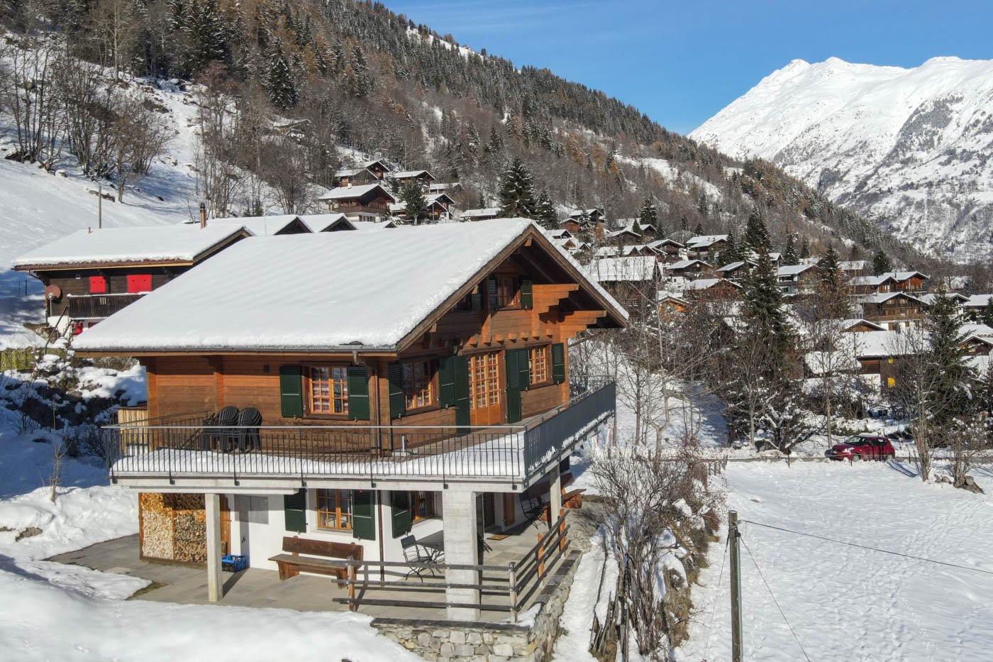 Mit dem Auto kann direkt neben das Chalet gefahren und parkiert werden. Die Zufahrts-Strasse ist asphaltiert und wintersicher.